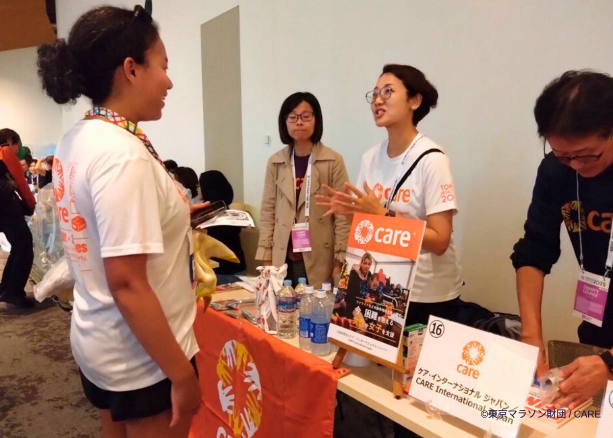 大会当日は、スタート前やフィニッシュ後にチャリティランナーの皆さまに寄付先団体ブースへお立ち寄りいただきました。ご支援への感謝をお伝えするとともに、CAREの特典ノベルティをお渡しいたしました。