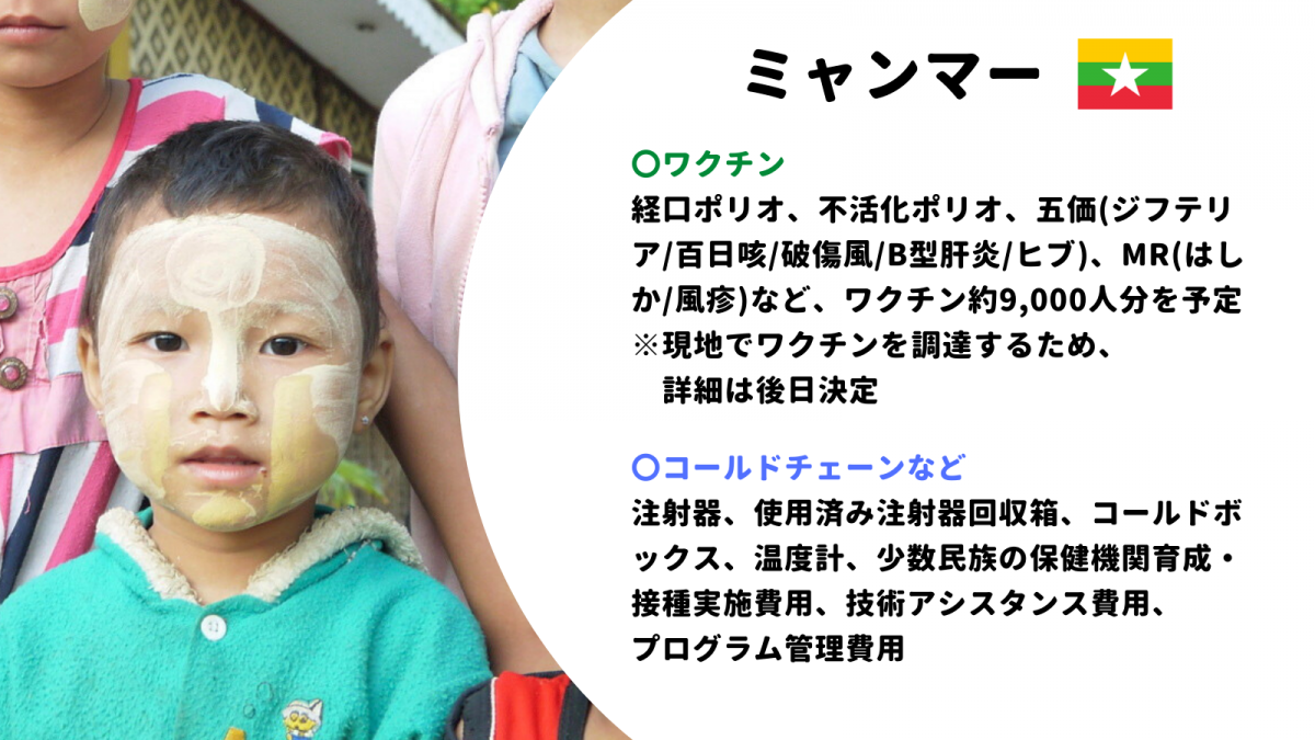 クーデターから5年にわたる内戦状態の中、昨年3月には大地震もあり、ワクチン接種が受けられていない子どもたちを中心に、ポリオやはしか、ジフテリアの発生が確認されています。子どもたちを守るため、1日も早い停戦と和平が必要です。JCVでは継続して少数民族地域の子ども9,000人にポリオ等のワクチンなどを贈り、地域のワクチン接種活動を支えます。