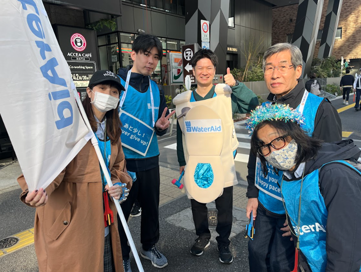 3月1日(日)の大会当日には、スタッフやボランティアの皆さまが、チーム・ウォーターエイドの応援団としてコース沿道の複数のスポットでチャリティランナーに熱い声援を送りました。ウォーターエイドの青いTシャツを着てくださっている方や笑顔で声援に応えてくださる方など、懸命にフィニッシュを目指すチャリティランナーの皆さまに、応援している側が元気をもらえる機会にもなりました。