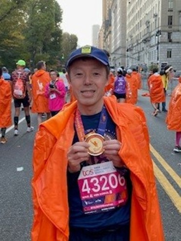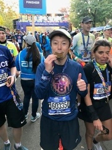 ニューヨークマラソンのメダルと共に/With his New York City Marathon finisher’s medal