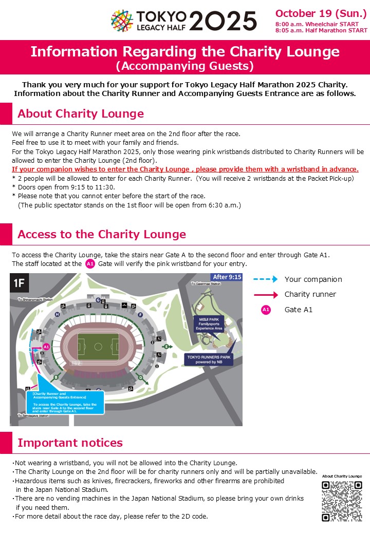 At this event, accompanying guests are also welcome to enter the Charity Lounge. While waiting for the runners to finish, please enjoy your time in the Charity Lounge! After the finish, we encourage all participants to join us in interacting with the charity organizations. *Enter from the 2nd Floor A1 Gate and follow staff instructions. *[Admission Time] 09:15 a.m.~11:30 a.m. *When your accompanying guests enter the Charity Lounge, they will need to wear the pink wristband distributed at the Packet Pick-up, so please be sure to hand it to them before the race. *If you are using a wheelchair, stroller, or similar device, please ask a nearby staff member for assistance. They will guide you. Click here for more details. |