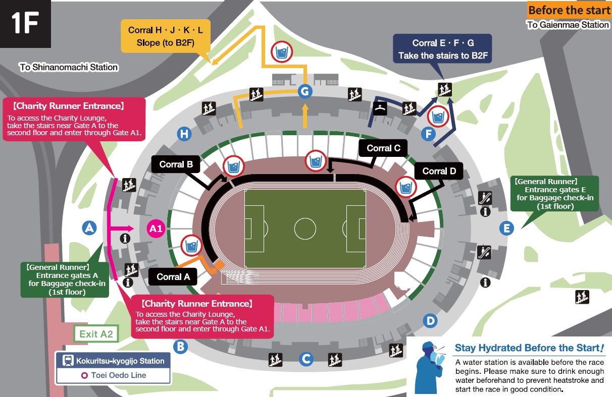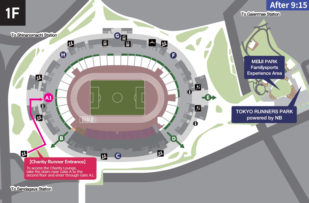 | Schedule until the start of the race | Please be sure to follow the staff's instructions from Gate A1 (2F) to the Charity Lounge. Changing rooms and baggage storage are available exclusively for Charity Runners. Please note that general runners will be directed to the 1st floor. *The Charity Lounge is located on the A Gate side (near Sendagaya Gate). *Bibs are required for entry. Please show your bib to the gate staff. ▼Before the start ![]() |